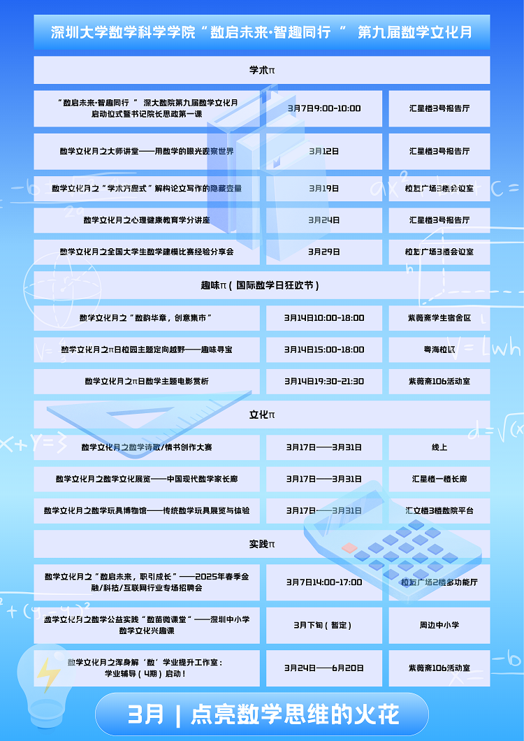 On March 7, 2025, the launch ceremony of the 9th Mathematics Culture Month of the School of Mathematical Sciences of Shenzhen University was successfully held. Wang Yu, Secretary of the Party Committee of the College, the dean, Ye Xing, Deputy secretary of the Party Committee, as well as counselors and student representatives attended the ceremony. The ceremony was presided over by Deputy Secretary Ye Xing.