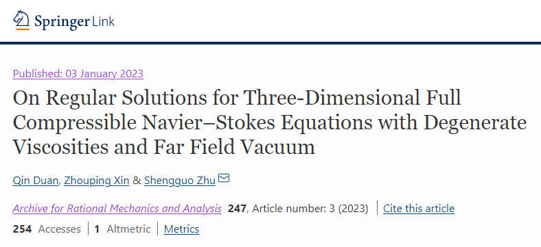 数学与统计学院副教授段琴与上海交通大学副教授朱圣国、香港中文大学蒙民伟数学教授辛周平合作的学术论文“On Regular Solutions for Three-Dimensional Full Compressible Navier-Stokes Equations with Degenerate Viscosities and Far Field Vacuum”。