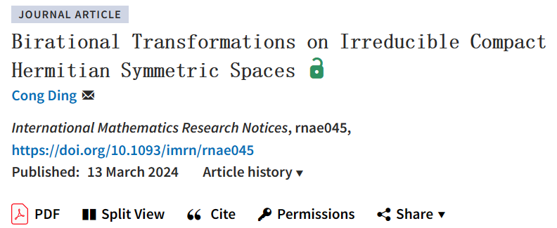 助理教授丁聪的学术论文“Birational Transformations on Irreducible Compact Hermitian Symmetric Spaces”。