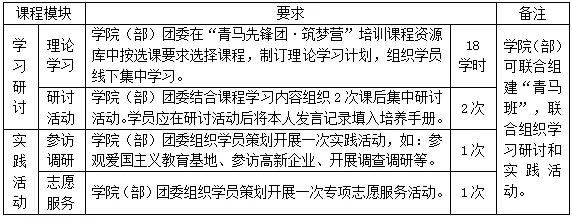 201901期“青马先锋团·筑梦营”培养课程分为理论学习、研讨活动、参访调研、志愿服务四个模块。