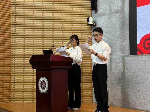 数学与统计学院第十八届学生会主席团成员王雨菡、田野同学进行履职宣誓。