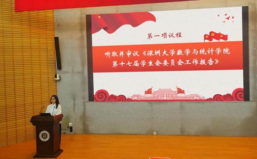 数学与统计学院第十七届学生会委员会工作报告》。陈梦琪总结在这一年中,学生会委员会积极响应学校领导的号召,认真履行自己的职责,开展了多项有意义的活动,解决了许多问题,包括但不限于评选先进班集体、筹备并开展了宿舍美化大赛等。学生会委员会认真总结了前几届的工作经验,不断改进工作方式方法,加强了对学生权益工作的重视和关注。陈梦琪还指出,学生会委员会在过去的一年里做的不好的及需要改进的方面,还需要继续深化和改进,真正做到“在你身边,为你代言”。