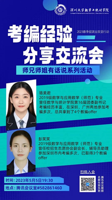 2023年5月5日,数学与统计学院师兄师姐有话说系列活动(20)之考编经验分享交流会在腾讯会议进行,本次分享交流会邀请到2019级骆美君、彭笑笑,两位已经考上教师编制的应届毕业生,为数院学子进行考编经验的分享。