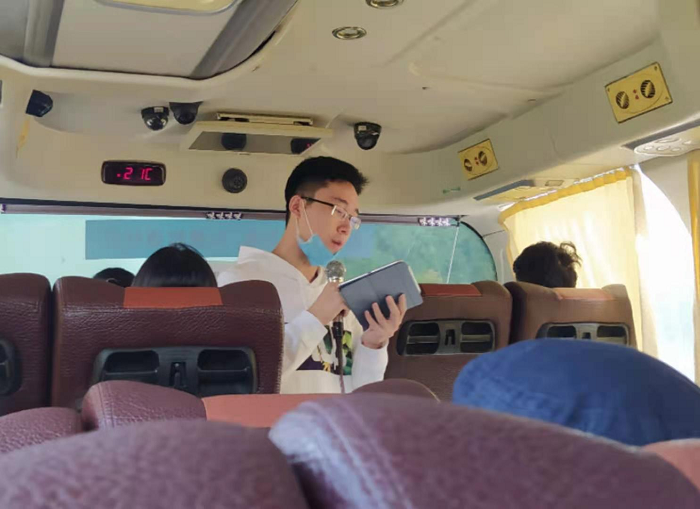 微党课学习部分,全体成员在前往博物馆的路上进行学习,主讲人是第二党支部党员冯王铖同学和第一党支部党员何诗妍同学。冯王铖同学的微党课内容主要是为同学们阐述民法典的制定和颁布历程、民法典的颁布将给我们生活中带来什么样的影响和为实施好民法典需要做的工作;何诗妍同学的微党课内容主要是为同学们讲述了什么是红色基因、不同的时代有什么的红色精神和如何讲好中国故事。