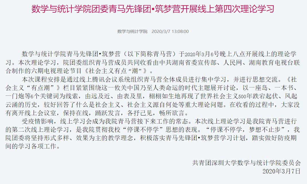 数学与统计学院青马先锋团•筑梦营(以下简称青马营)于2020年3月6号晚上八点开展线上的理论学习。本次理论学习,院团委组织青马营成员共同收看由中共湖南省委宣传部、人民网、湖南教育电视台联合制作的六期电视理论节目《社会主义有点“潮”》。