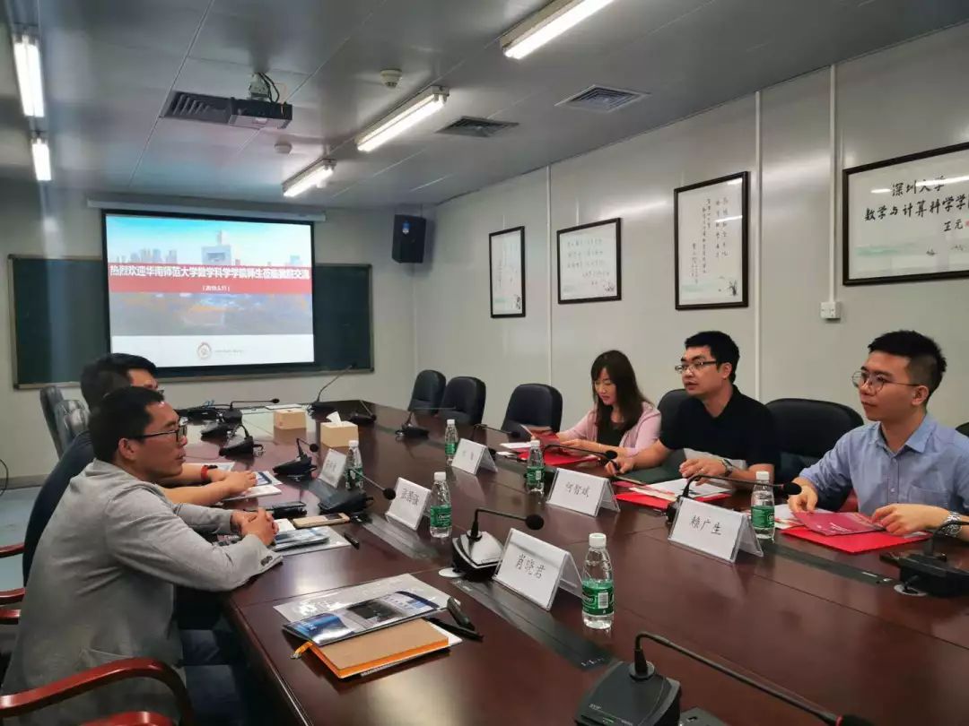 会上,张国强副书记首先简要介绍了我院概况,随后与华师数科院团委书记何智斌老师、院团委教工副书记赖广生老师、辅导员甘俊老师一同围绕数学专业学生科技创新工作的探索和思考、自媒体时代下学生干部发展及学生活动特色品牌凝练以及高校学风建设的路径分析几个重点议题展开讨论。