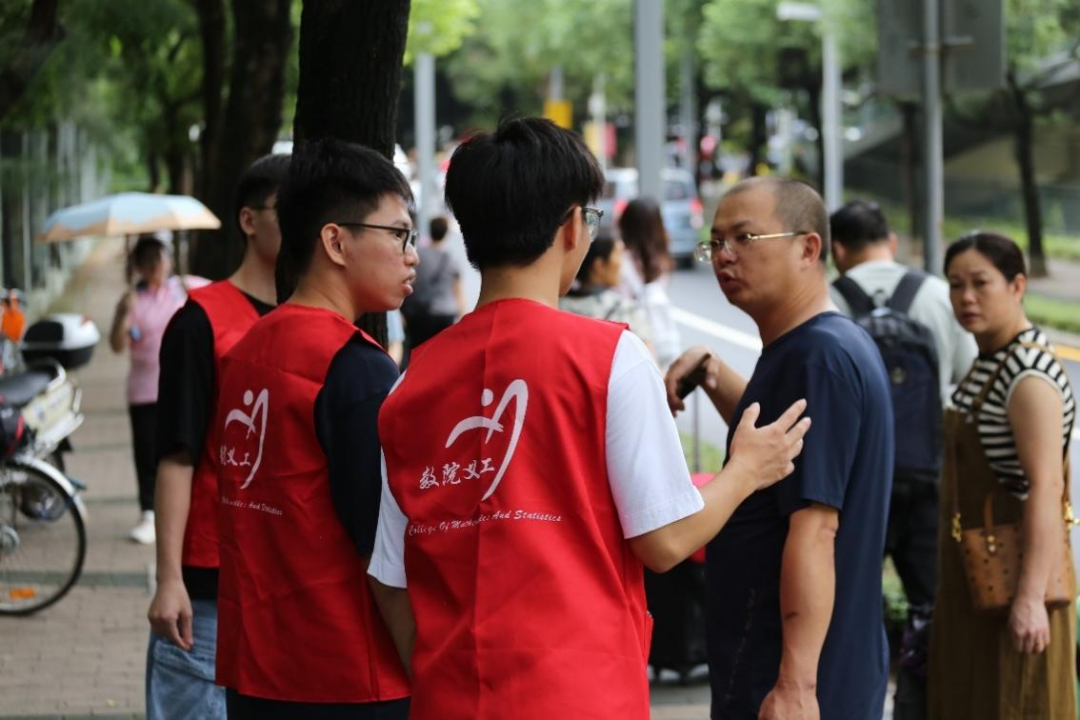 在新生首日到校时,数院团委、学生会以及志愿者们也在努力为新生报到提供迎新帮助。早晨八点,数院志愿者们便在各大校门口、新生宿舍楼下以及汇星楼一楼集合,他们手举数院专业指引牌,引导数院新生进行报到与宿舍安置。65名学长学姐主动报名成为迎新志愿者,担当起帮助新生搬运行李、引导新生进行报到、介绍学校场馆设施、为新生答疑解惑等重任。正是因为以前受过学长学姐帮助,志愿者们冲在最前线,奔波在学校各个角落,为新生们服务。这份热忱一定会由各届数院学子们一届一届地传承下去,成为数院团学乃至整个数院的不朽精神。