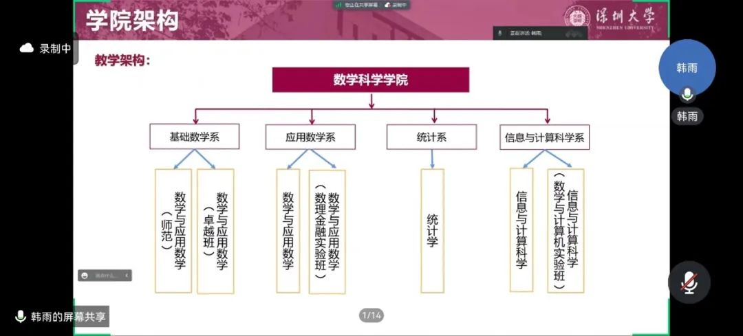 现有专任教师98人,教授20人、副教授44人,并有四位教授入选了国家级项目。韩院长对今年的招生情况作了简要概括和数据展示,在学校按照广东省省内生源进行排名录取的21个教学单位中,数院排在第五位。韩副院长从专业分类和培养方向上为家长们作了细致的讲解,包括各专业的基本情况以及二次选拔考试和转专业的具体流程。最后韩院长在教学特色、培养特色以及学生毕业去向等方面也进行了补充说明。