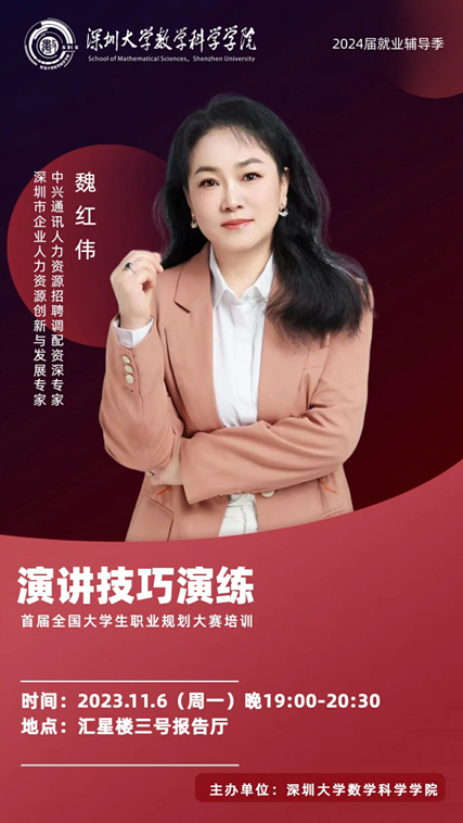 在汇星楼三号报告厅举办了2024届就业辅导季之生涯规划与就业指导分享会暨首届全国大学生职业规划大赛赛前指导培训第五场《演讲技巧演练》,本次讲座邀请到中兴通讯人力资源招聘专家魏红伟老师主讲。