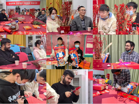1月18日下午,院党委王瑜书记、张国强副书记、辅导员肖晓君老师、研究生秘书刘欢老师在汇星楼501活动室慰问我院寒假留校学生,向同学们致以美好的新春祝福。师生齐聚一堂,两位2022级外籍博士生第一次在中国过年,大家一起插花、剪纸、贴春联、品尝下午茶点,共度温馨、欢乐、喜庆、祥和的时光。