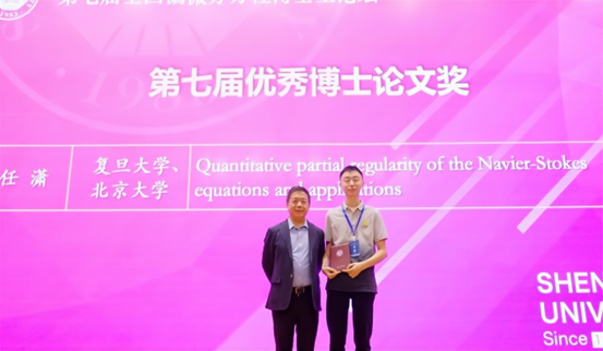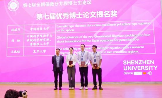 全国偏微分方程优秀博士论文奖获得者任潇(复旦大学、北京大学);优秀博士论文提名奖获得者林道问(中国科学技术大学)、刘松(中国科学院数学与系统科学研究院、香港理工大学)、王兆钰(复旦大学)分别上台领奖,辛周平教授为获奖博士颁奖。