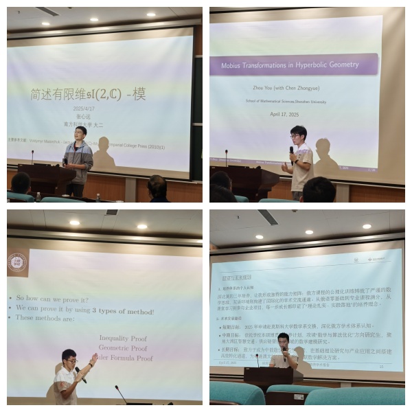 随后,南方科技大学的张心远同学以“简述有限维SI(2,C)-模”为题、我院的周游同学以“双曲几何中的莫比乌斯变换”为题、我院的刘胤廷同学以“正多面体存在性的几何与欧拉公式证明”为题,以及北理莫斯科大学的刘博文同学以“自己的学术经历”为题,分别分享了自己在课程学习之外的一些创新思考和学习体会。