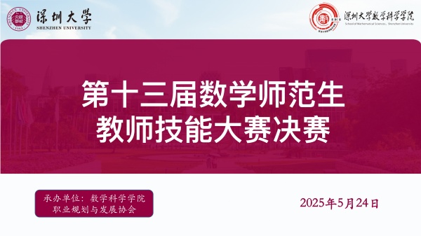 第十三届数学师范生教师技能大赛的决赛在校友广场303会议室举行。经过前期两轮初赛的两次筛选,共有10位优秀选手晋级本届决赛。作为推进教师教育高质量发展的重要实践,本届大赛紧扣新时代基础教育需求,聚焦师范生核心素养培育,通过"以赛促教、以赛促学、以赛促研"模式,检验数学师范生教学实践能力与专业发展潜力,为师范生搭建教学能力展示平台,助力基础教育人才梯队建设。