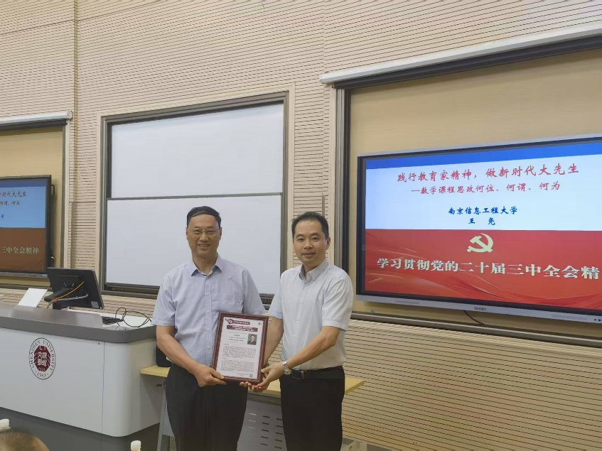 荔园名师讲坛第十五期在粤海校区汇星楼一号教室开讲,讲座题目为:弘扬教育家精神,做新时代大先生——数学课程思政何位、何谓、何为。南京信息工程大学原党委副书记副校长(正校级)、二级教授、博士生导师王尧教授作为此次报告主讲人,为全院教师带来一场精彩的课程思政报告。讲座由学院院长主持,并为王尧教授颁授讲座纪念牌。