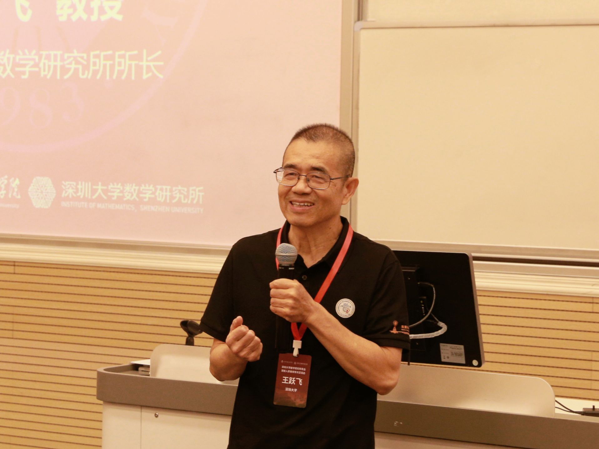会上,学院名誉院长、数学研究所所长王跃飞教授发表开幕式致辞。他首先对远道而来的参会专家致以诚挚欢迎与衷心感谢,随后系统介绍了数学研究所的发展历程与建设成果:自2022年9月经学校批准设立以来,研究所历经3年,已组建起一支高水平科研队伍,现有研究人员二十余名,其中包括国家杰出青年基金获得者 3 人、教育部重大人才计划入选者 1 人、优秀青年基金获得者 3 人。研究方向聚焦复分析与复动力系统、非线性偏微分方程、数学优化等核心领域。王跃飞教授表示,数学研究所的发展离不开同行学者们的支持,尤其感谢沈维孝院士和参会专家们的鼎力相助,数学研究所的成员们将继续努力,将数学研究所打造成具有国际影响力的基础数学研究平台。