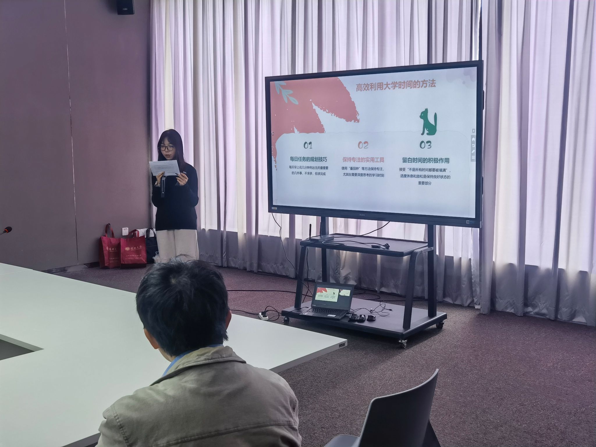 本次会议,学院特邀了去年寒招优秀负责人侯珮瑶同学为大家分享寒招经历。侯同学详细介绍了寒假招生宣传的前期筹备、进展过程、后期总结以及自己的一些感受,图文并茂地让大家看到了寒招工作的重要性和影响力。随后,我院数学与应用数学(卓越班)24级黄雅琪同学分享了自己的一些大学经验,提到了大学与高中学习方式的不同,讲述了自己对于时间和精力的管理,以便于在课堂外参加社团、学生工作以及志愿活动,以此来提高自己。
