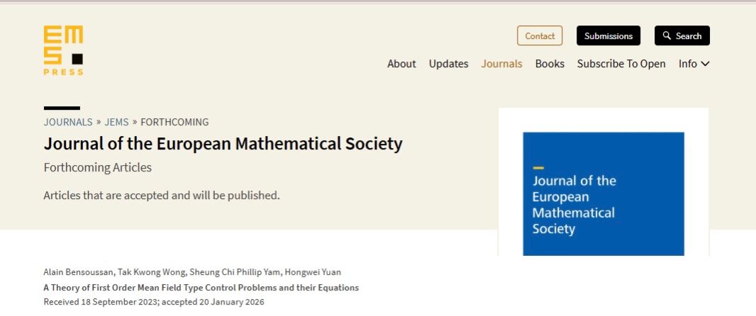 微分方程与应用科研团队王德光(Wong Tak Kwong)副教授与德克萨斯大学达拉斯分校Alain Bensoussan教授、香港中文大学任尚智教授、澳门大学袁洪炜助理教授合作的学术论文“A Theory of First Order Mean Field Type Control Problems and their Equations”被国际知名学术期刊“Journal of the European Mathematical Society”接受发表。