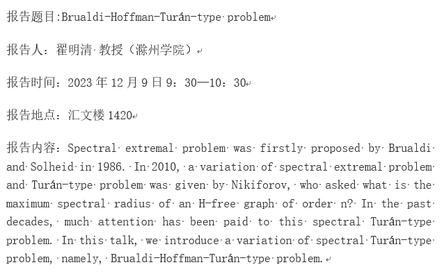 报告人简介:翟明清,滁州学院教授,2010年博士毕业于华东师范大学运筹学与控制论专业,2012年获评教授,2022年获聘安徽师范大学博士生导师。近年来在J. Combin. Theory B, J. Graph Theory, European J. Combin., Electron. J. Combin.等期刊发表学术论文40余篇,主持国家自然科学基金2项。研究方向:图谱理论,谱极值图论。