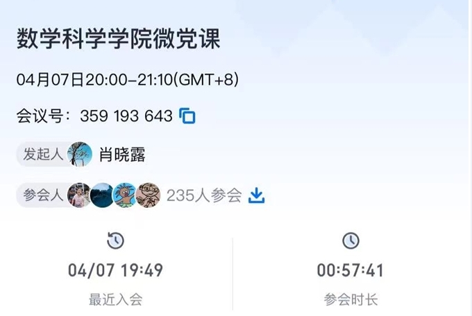 分党校组织四个学生党支部联合开展了2024年第一次集中微党课。此次微党课通过腾讯会议形式进行,由本科生第二党支部承办,本科生和研究生党员、发展对象、积极分子共235人参加,发展对象马宇浩同志主持。