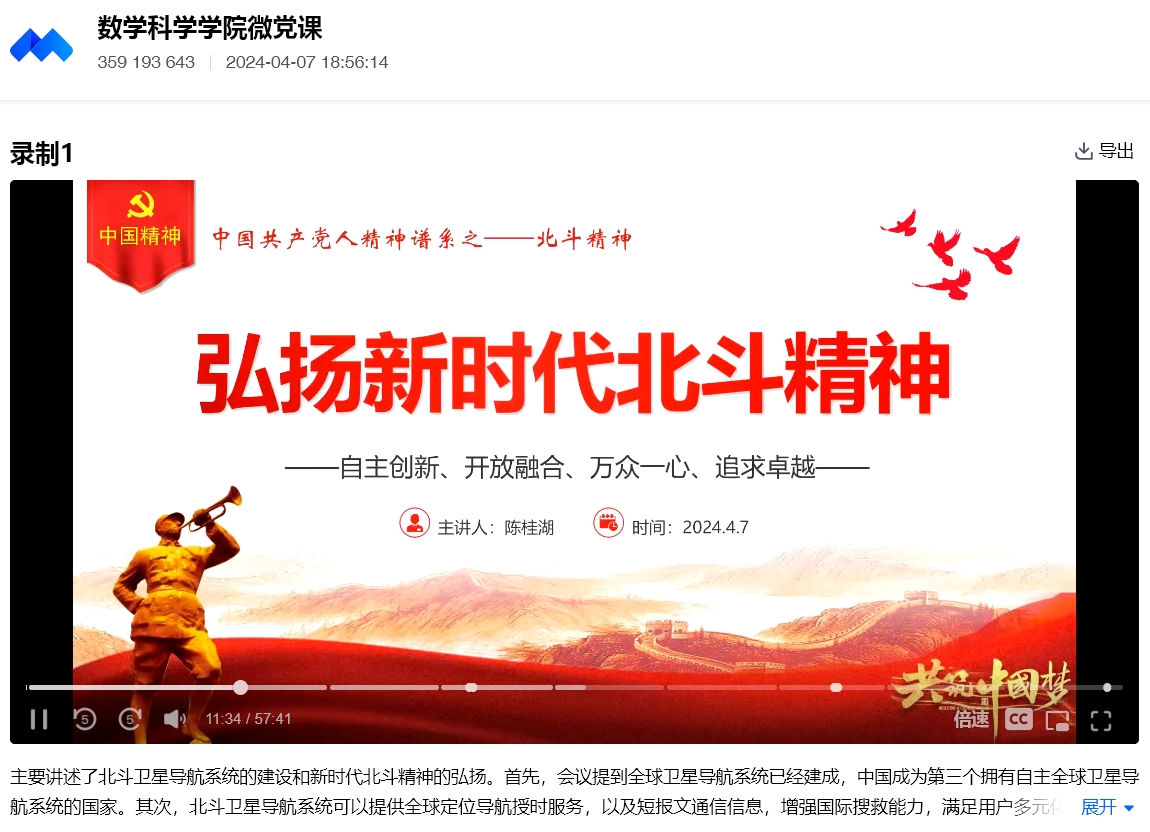 首先,党员陈桂湖以“弘扬新时代北斗精神”为主题,分享了我国科技工作者克服重重困难,从无到有建立自主全球卫星导航系统的事迹。从1994年立项到2000年建成北斗一号系统,以及后面迭代更新北斗二号以及北斗三号,北斗人克服重重困难最终完成使命。2000年北斗一号系统的建成标志着我国正式成为世界上第三个拥有自主卫星导航系统的国家。同学们对北斗人始终秉承航天报国、科技强国使命情怀肃然起敬。“自主创新、开放融合、万众一心、追求卓越”的新时代北斗精神,已成为“两弹一星”精神、载人航天精神的血脉赓续,不仅激励着新时代北斗人继续前行,也激励鼓舞着数院的同学们传承发扬新时代北斗精神和科学家精神,不忘初心,牢记使命,努力学好专业知识,将来为加强我国基础研究,实现我国高水平科技自立自强贡献自己的力量。