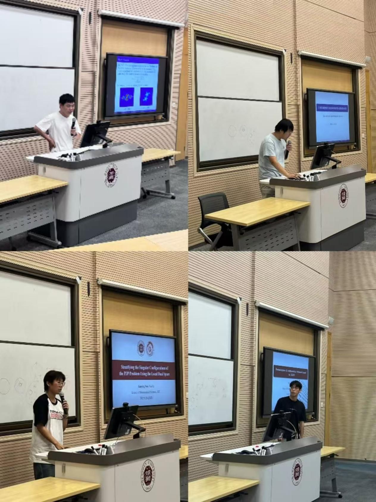 202同学汇报了《Non-recurrent rational maps with disconnected Julia set》、2024级数学学术博士同学汇报了《无向简单图给定分离数和阶数的最小谱极值和极图》、2024级数学学术硕士梁世鸿同学汇报了《Formalization of mathematical theorems based on LEAN》、2024级数学学术硕士孙雪莹同学汇报了《Stratifying the singular configurations of the P3P problem using the local dual space》。